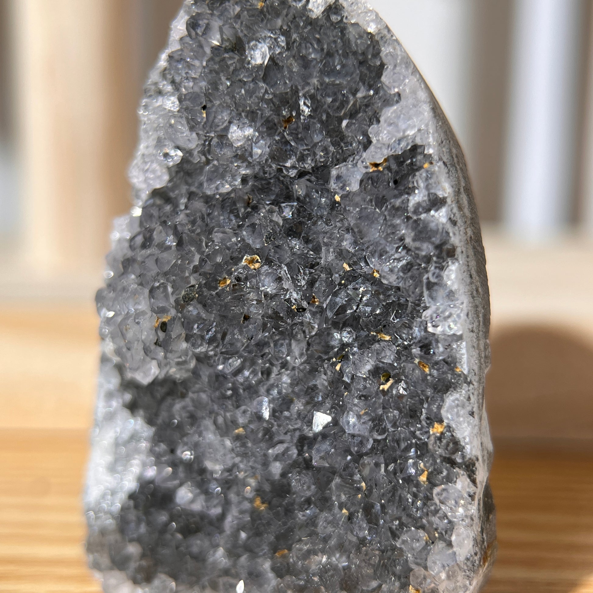 Clusters with tiny black spots are a result of their symbiosis with Hematite, a grounding and stabilizing mineral that enhances focus and concentration. This will not affect the energy of the Amethyst Crystal Cluster.