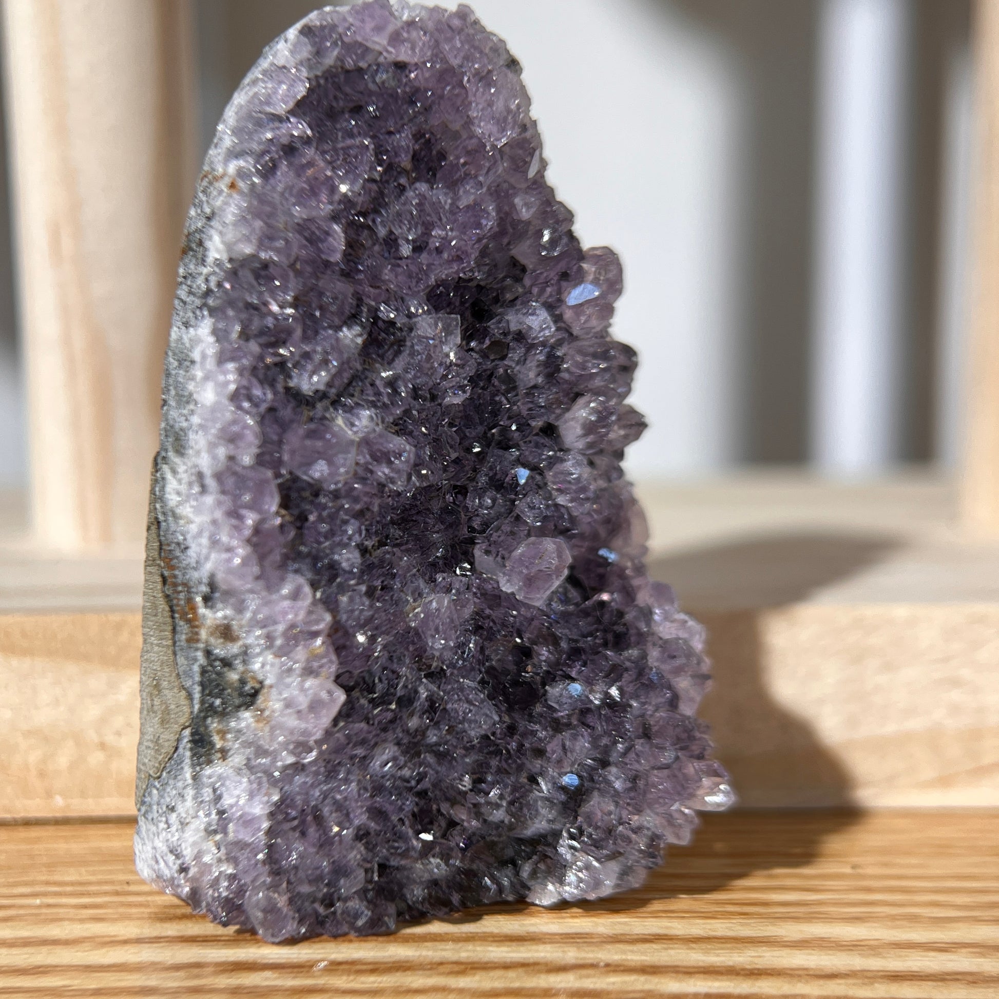 Clusters with tiny black spots are a result of their symbiosis with Hematite, a grounding and stabilizing mineral that enhances focus and concentration. This will not affect the energy of the Amethyst Crystal Cluster.