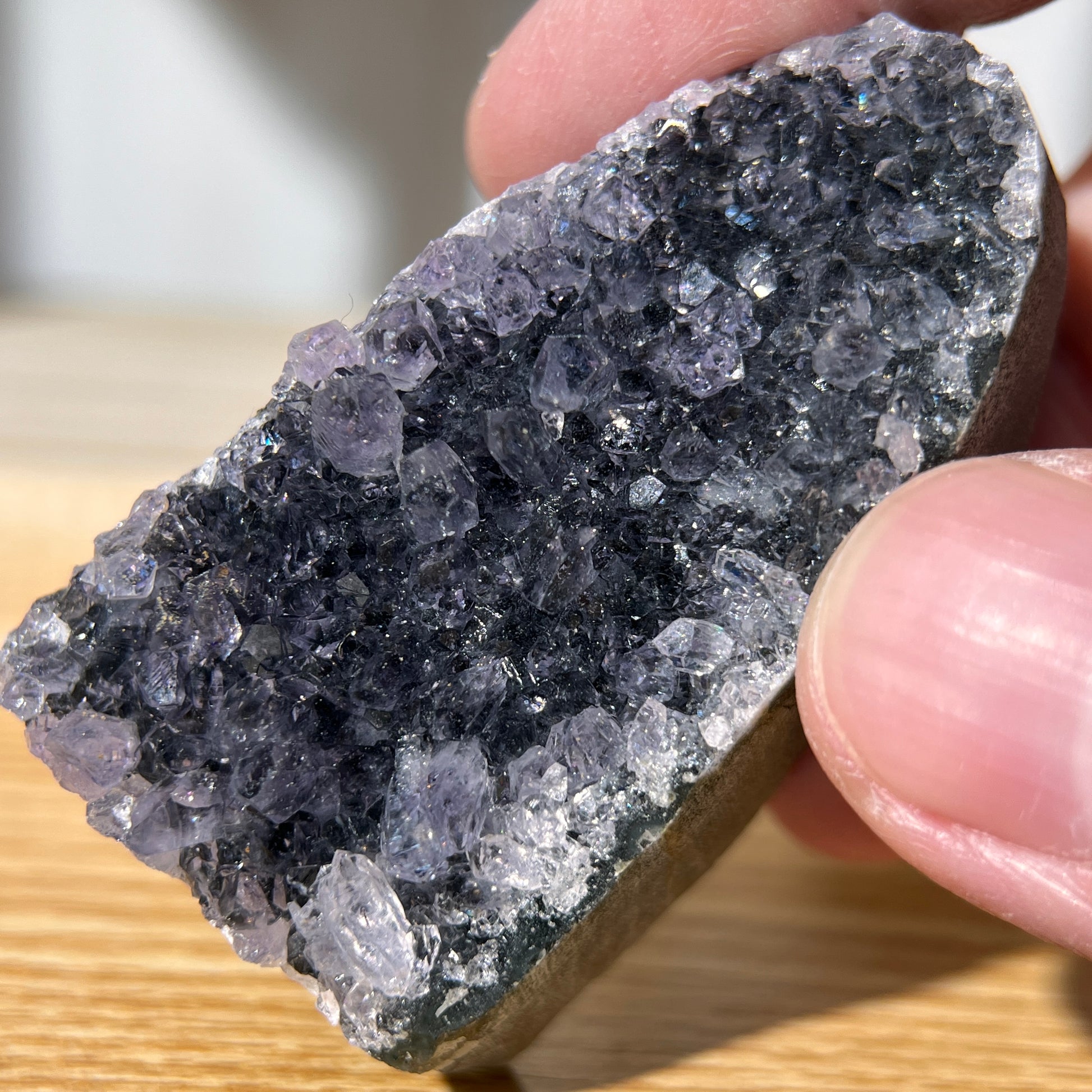 Clusters with tiny black spots are a result of their symbiosis with Hematite, a grounding and stabilizing mineral that enhances focus and concentration. This will not affect the energy of the Amethyst Crystal Cluster.